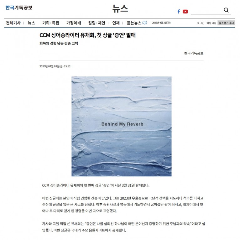 뮤직타임 [기사] CCM 싱어송라이터 유채희, 첫 싱글 '증언' 발매(한국기독공보)