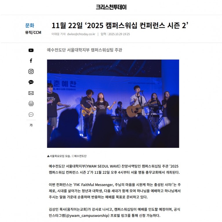 [기사] 11월 22일 ‘2025 캠퍼스워십 컨퍼런스 시즌 2’(크리스천투데이)